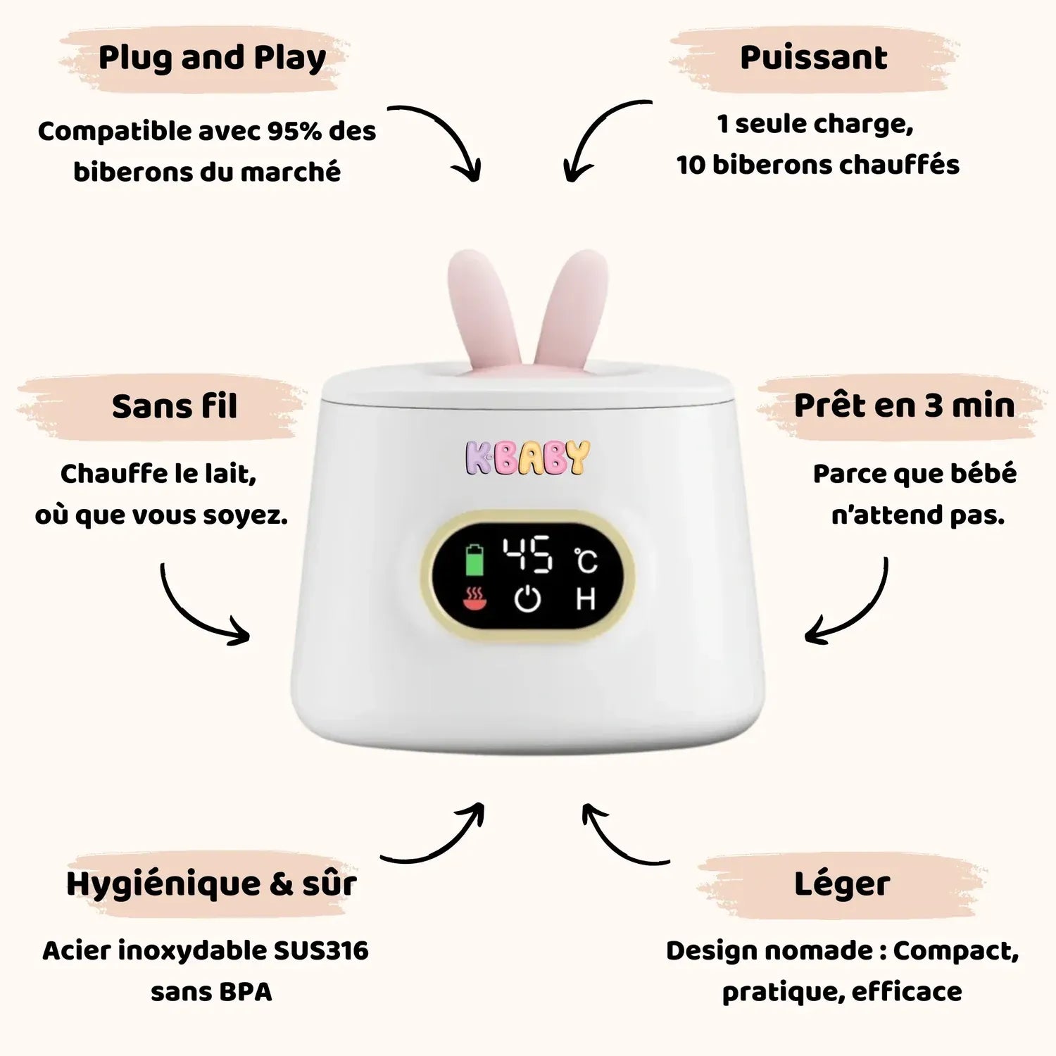 Avec une batterie pleine, vous pouvez réchauffer jusqu'à 8 biberons ou maintenir un biberon au chaud jusqu'à 10 heures. Le chargement est facile via USB-C.